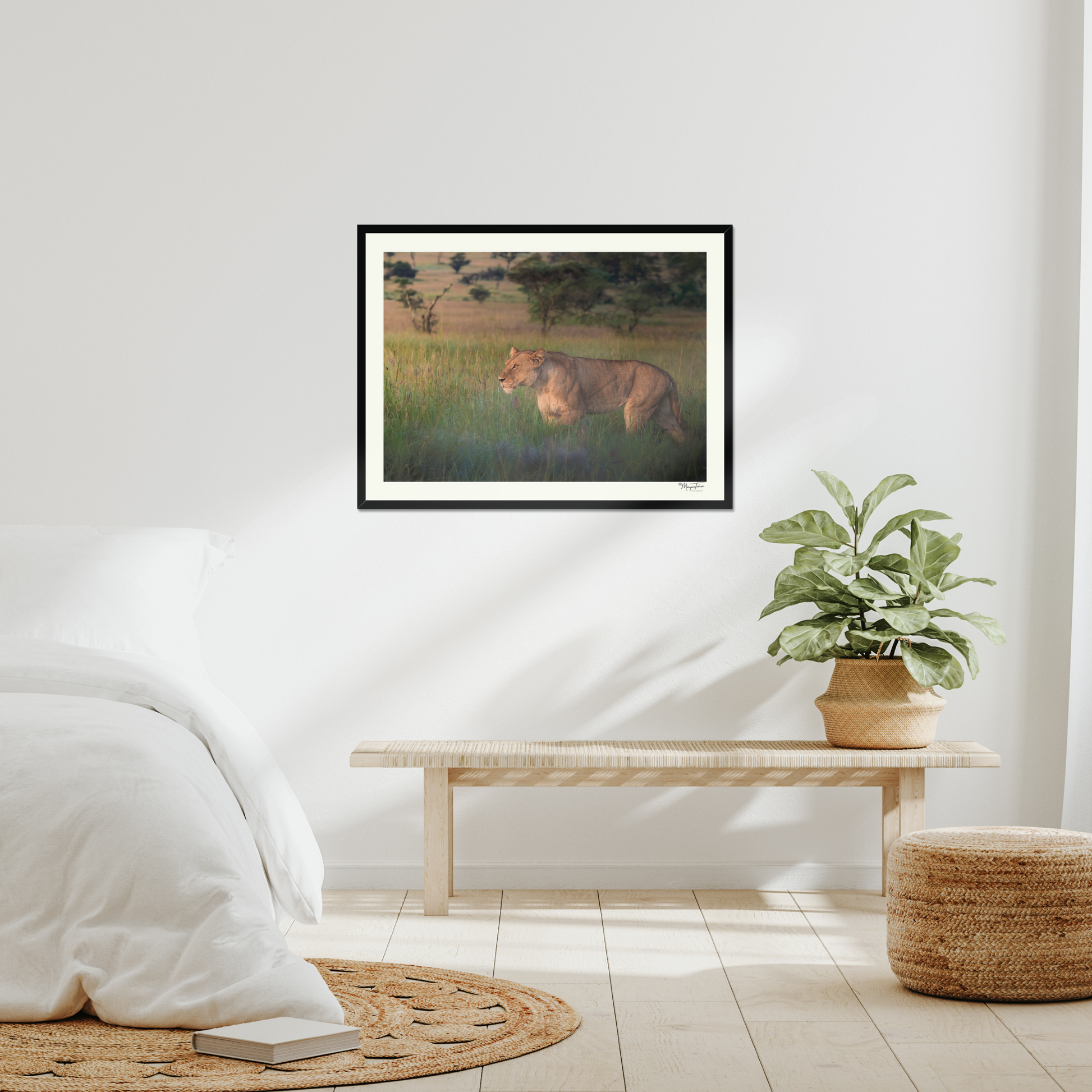 Queen of the Dawn captures a rare and powerful moment in the Serengeti as a lioness moves silently through the golden morning grasslands. Photographed at first light, this image reflects both strength and serenity, a true embodiment of Africa’s untamed beauty.