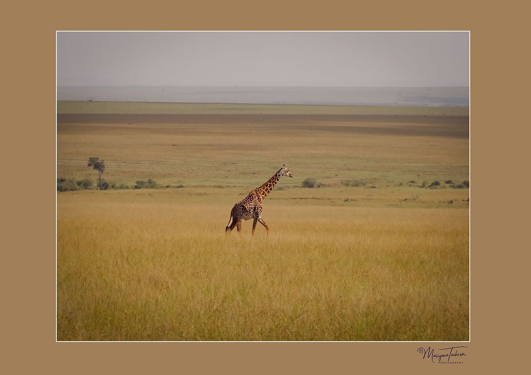 Surrounded by sweeping grasslands that stretch endlessly toward the horizon, the composition emphasises scale and stillness. The giraffe’s elongated silhouette rises above the savannah, creating a striking focal point against the soft, layered landscape. The muted earthy tones and open space evoke a sense of tranquillity, freedom and connection to the raw rhythm of the wild.