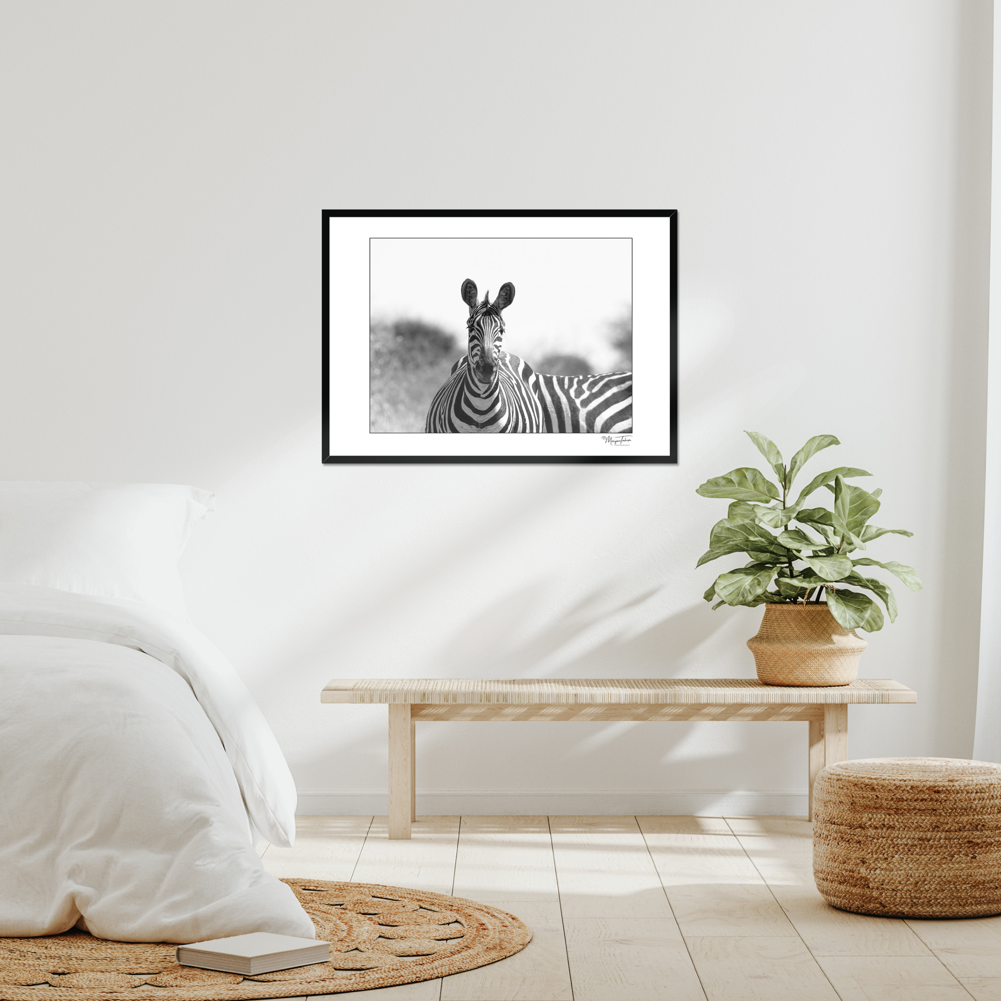 Rendered in timeless black and white, the composition emphasises contrast, texture and pattern. Every stripe tells its own story, bold, unrepeatable and intricately designed by nature. The monochrome treatment removes distraction, drawing full focus to the symmetry of the face, the alert ears and the powerful graphic flow across the body.