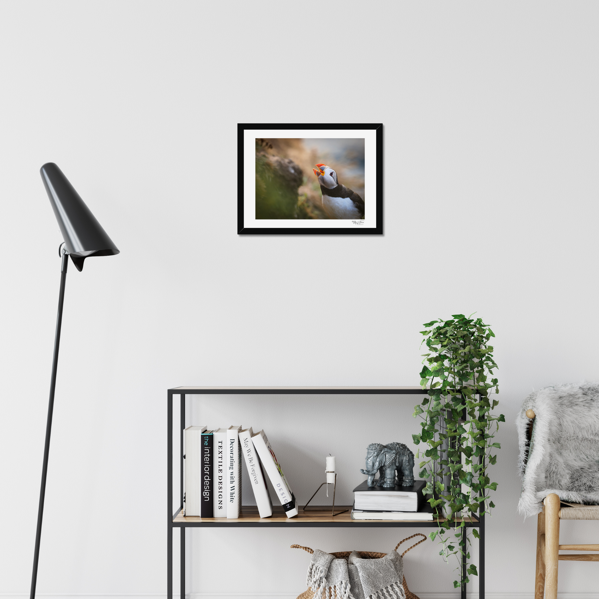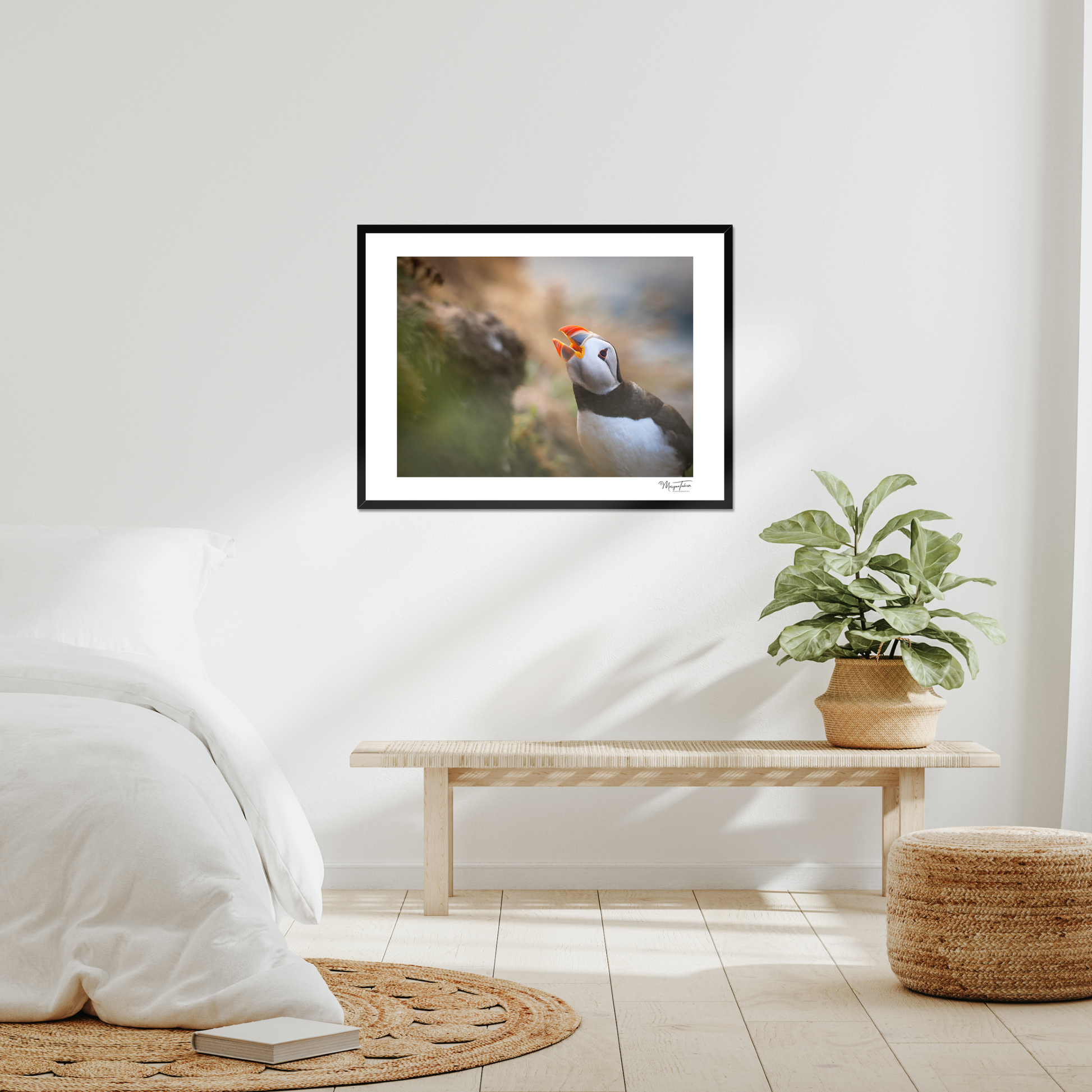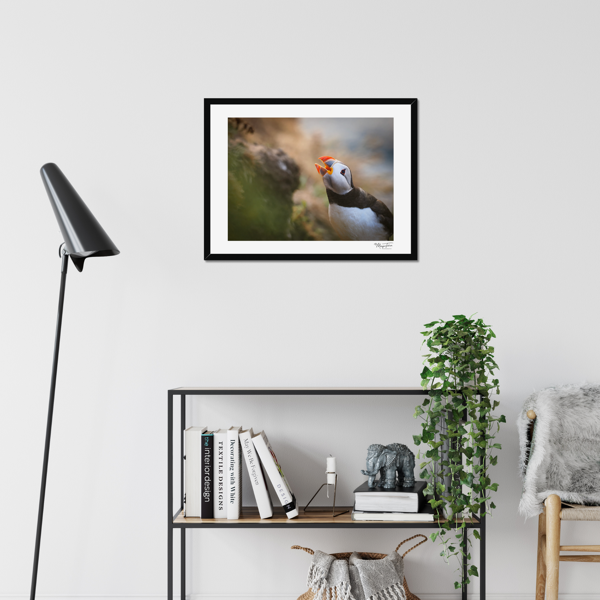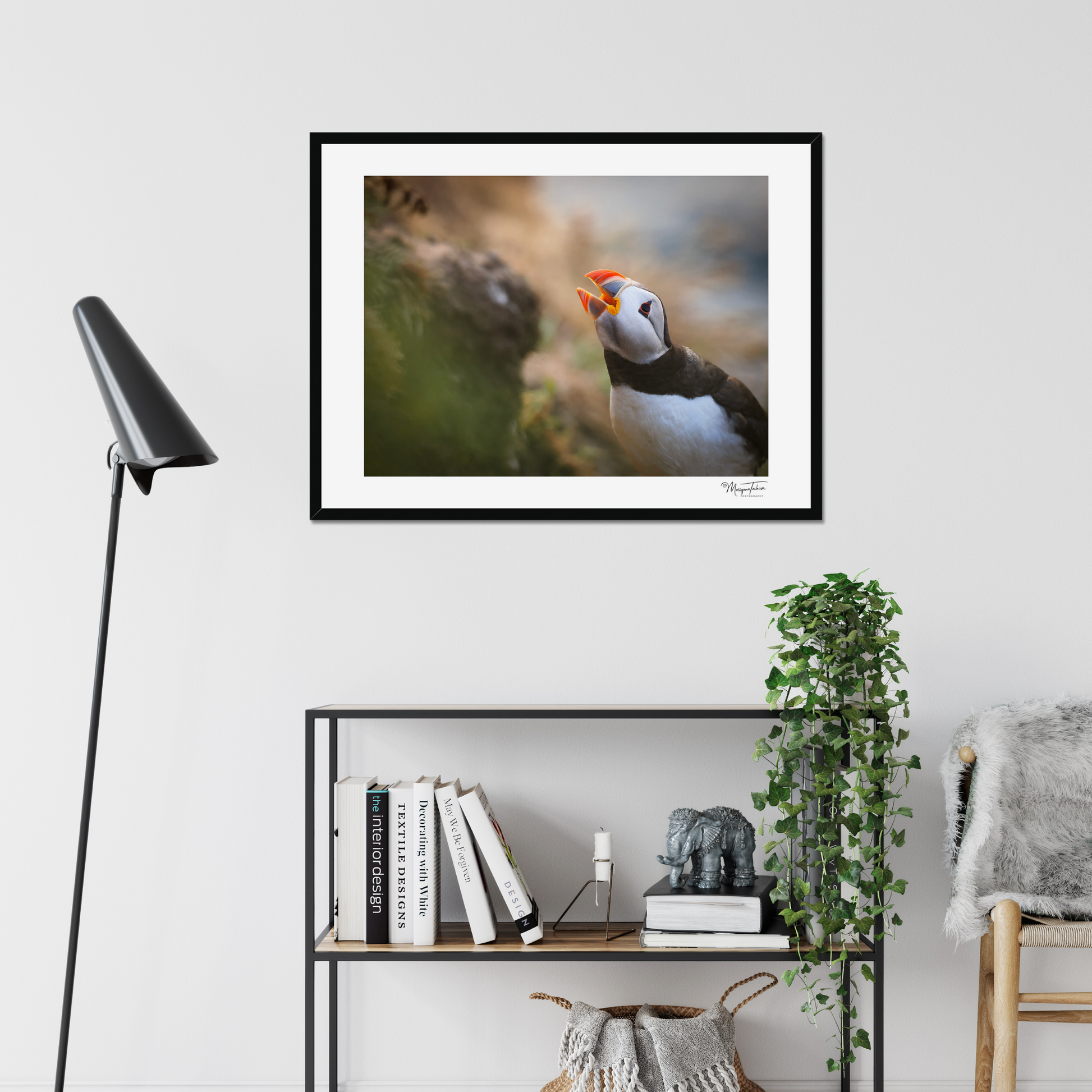 The Call captures a vibrant and expressive moment as a puffin tilts its head skyward, beak open in what feels like a spirited cry into the wild. The striking contrast of its vivid orange beak against its monochrome plumage creates a captivating focal point, full of character and life.